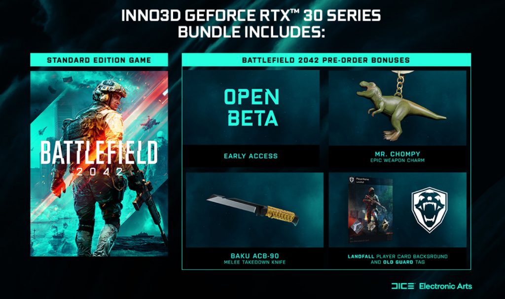 It looks like Battlefield 2042 will be the next game to be bundled with RTX 30 series graphics cards. That's according to Inno3D, who will include the game with RTX 3090, 3080 Ti, 3080, 3070 Ti, or 3070 graphics cards, as well as pre-built systems featuring one of these GPUs.
