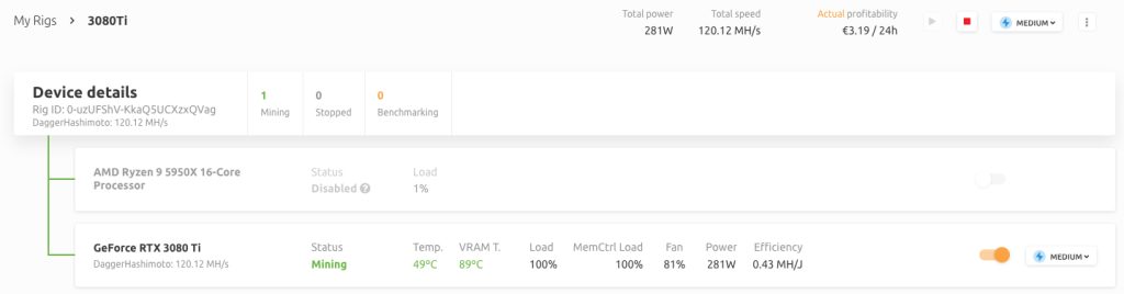 | RTX 3070 Ti LHR | ~ 81 MH/s |