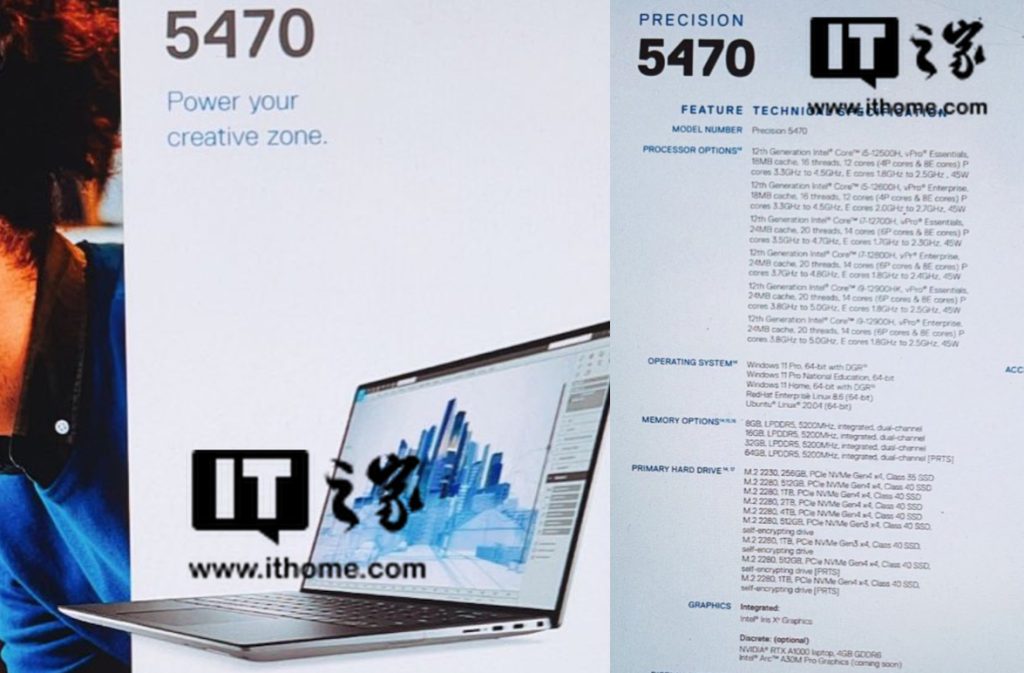 The Dell Precision 5470 leaflet leaked by ITHome (via HXL) details the specifications of the 14-inch laptop, which offers multiple Intel Alder Lake-H CPU options, up to 64GB of DDR5-5200 memory, and up to 4TB of PCIe 4.0 SSD storage. The most interesting part is at the bottom of the spec sheet, where Dell listed “Intel Arc A30M Pro graphics” as an option. As an alternative, the Precision 5470 can also feature the recently announced Nvidia RTX A1000.