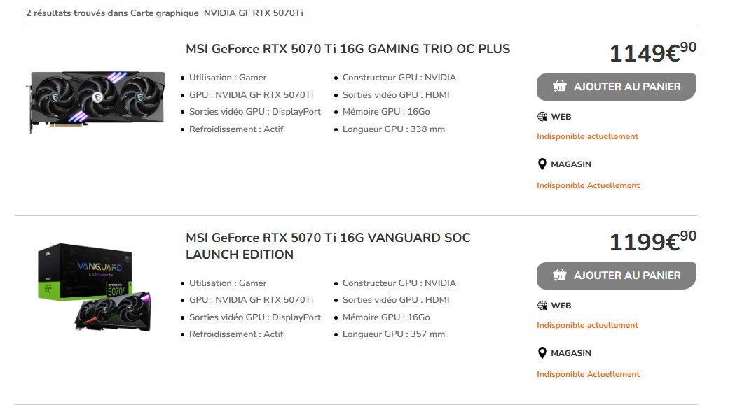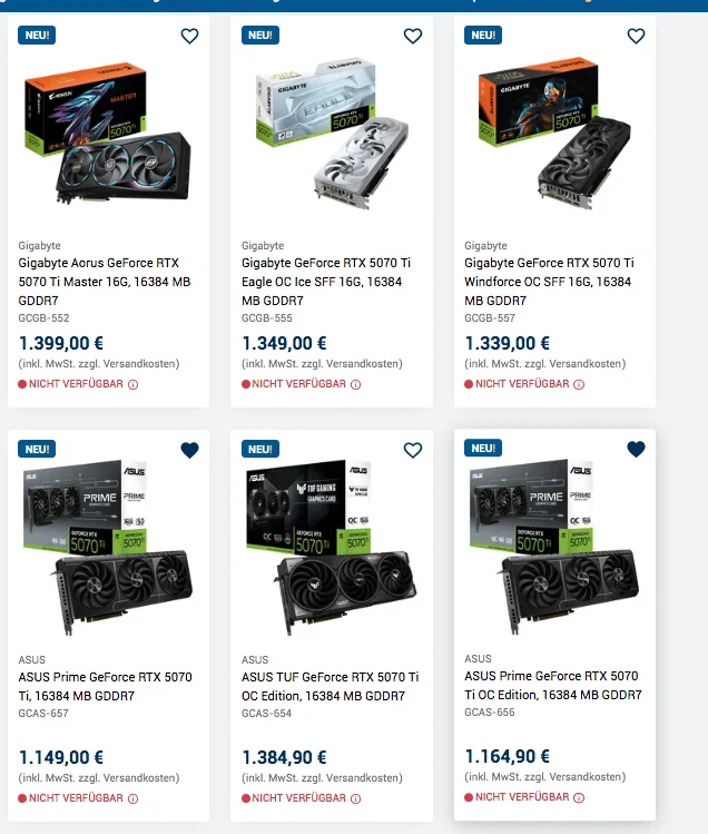 Starting with the RTX 5070 Ti listings, MediaMarkt (via VideoCardz) over in Austria listed an MSI RTX 5070 Ti GAMING TRIO OC PLUS at €1,169, a premium of roughly 30% over the expected European MSRP. Similar pricing has been observed elsewhere, with the same card appearing in France (thanks @GawroskiT) for €1149.90 and various Asus and Gigabyte models listed in Germany (via danilluzin) starting at around that same value. MediaMarkt also shows February 20th as the release date, like MSI France.