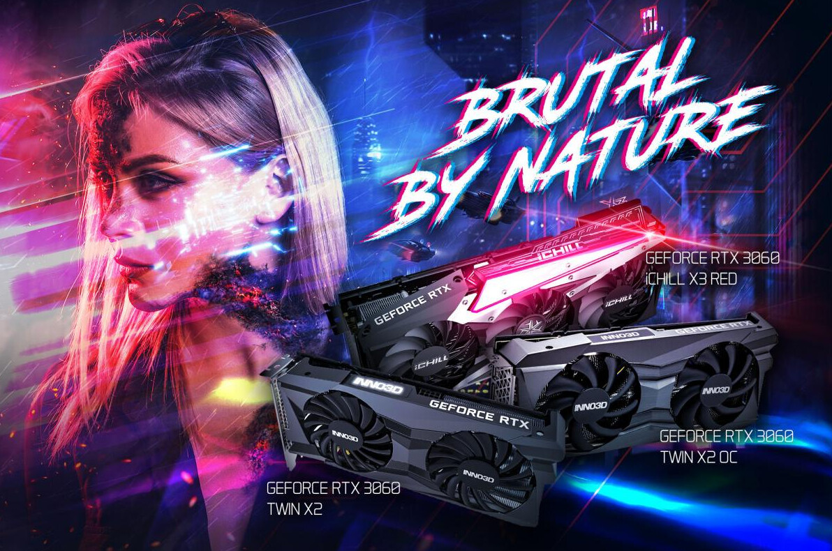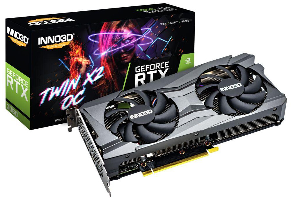 Inno3D's initial RTX 3060 lineup includes the Twin 2x (OC) series, featuring a backplate for added protection and dual-fan design (90mm fans) that cools the heatsink connected to the GPU by 4x heat pipes. The non-OC Twin 2x card is stock clocked, but the OC variant boosts up to 1792MHz.