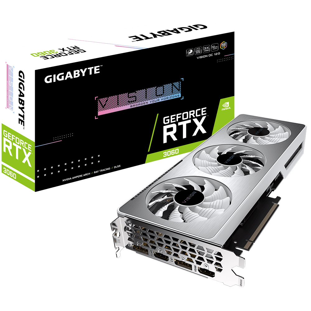 Gigabyte RTX 3060 Vision cards come with a unique “elegant silver and white” theme, staying away from the most common black and grey coloured graphics cards. Suitable for white-themed PCs, the Vision cards feature a triple-fan design similar to the one used on the Gaming cards, ensuring stable operation and high-performance of the GPU.