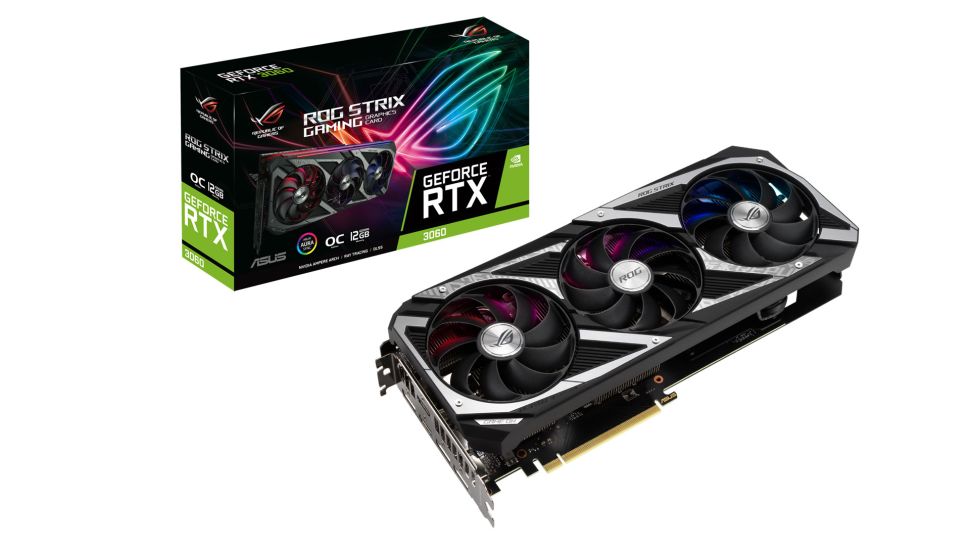 ASUS' top of the line RTX 3060 is the Strix model, available in OC and non-OC models. This uses a triple-fan cooler, with a stylish-looking shroud, and 2.7-slot cooler. It also sports dual-BIOS capabilities, as well as a metal backplate.