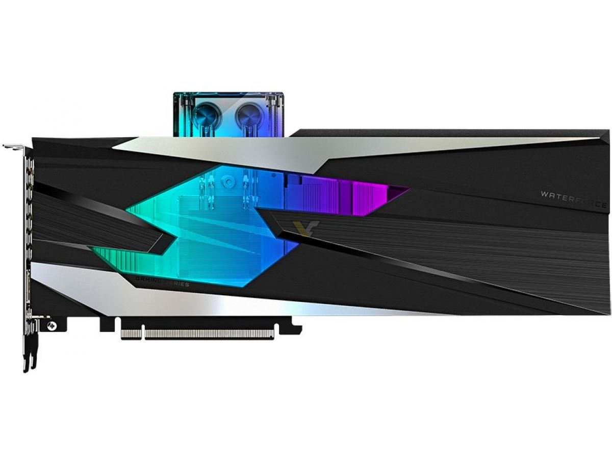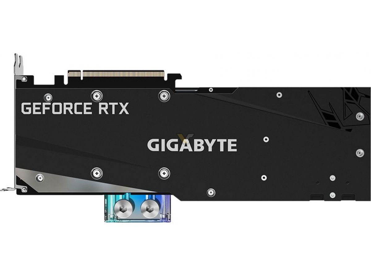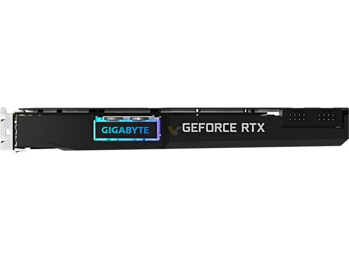 According to VideoCardz, the upcoming RTX 3080 Gaming OC WaterForce WB comes with 3x DisplayPorts 1.4a and 2x HDMI 2.1 ports. The card is covered by a small acrylic window with RGB lighting surrounded by a black and grey shroud. Featuring a 2-slot design, the card is powered by 2x 8-pin power connectors.