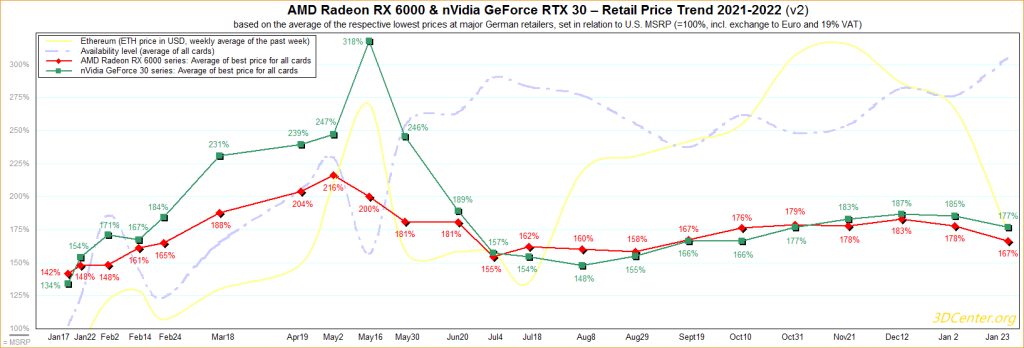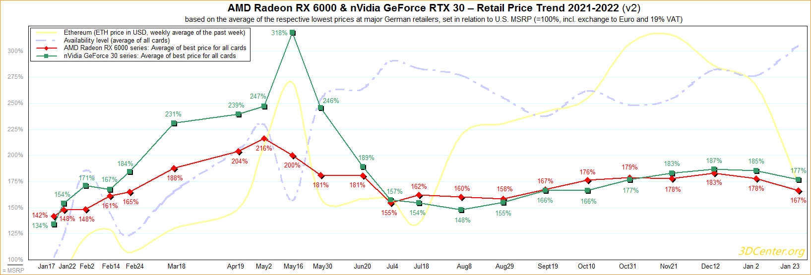 The data gathered and shared by 3DCenter.org until January 23rd shows that the average best price of Nvidia graphics cards is 77% more than their MSRP, an 8% reduction compared to the data from January 2nd. As for the AMD Radeon RX 6000 series, the best prices are about 67% higher than their MSRP, which translates into a 10% cut compared with January 2nd.