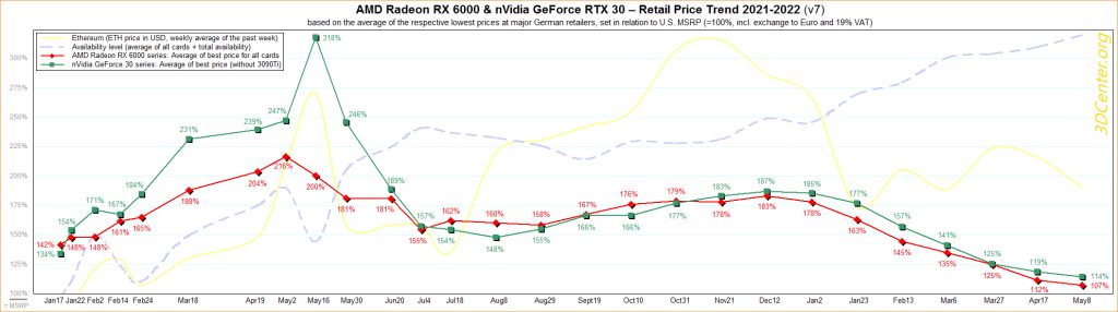 On the Nvidia side, the RTX 3070 Ti and RTX 3080 both dropped by 7% since April 17th, and the RTX 3090 dropped by 8%. Oddly enough though, the RTX 3050 had its prices rise by 7 percent.