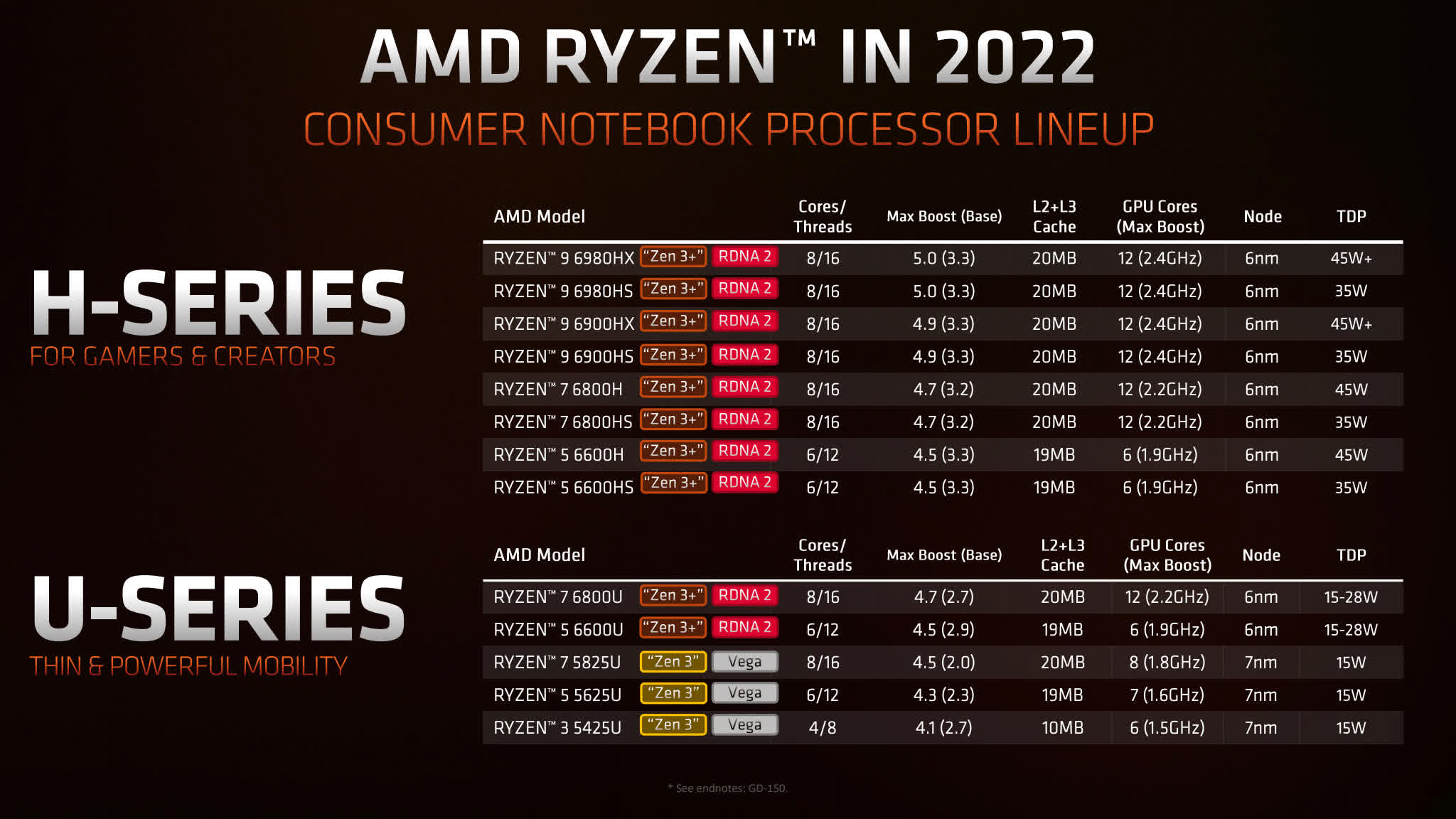 The Ryzen 6000 series will be divided into H and U-series SKUs, featuring clock speeds of up to 5.0GHz in the former and 4.7GHz in the latter. The H-series APUs' TDP range from 35W to over 45W, while the U-series vary between 15W and 28W. It's worth noting that there are also refreshed Ryzen 5000U APUs coming out: the Ryzen 7 5825U, the Ryzen 5 5625U and the Ryzen 3 5425U. These are based on the “older” Zen3 CPU architecture and have Vega iGPUs.