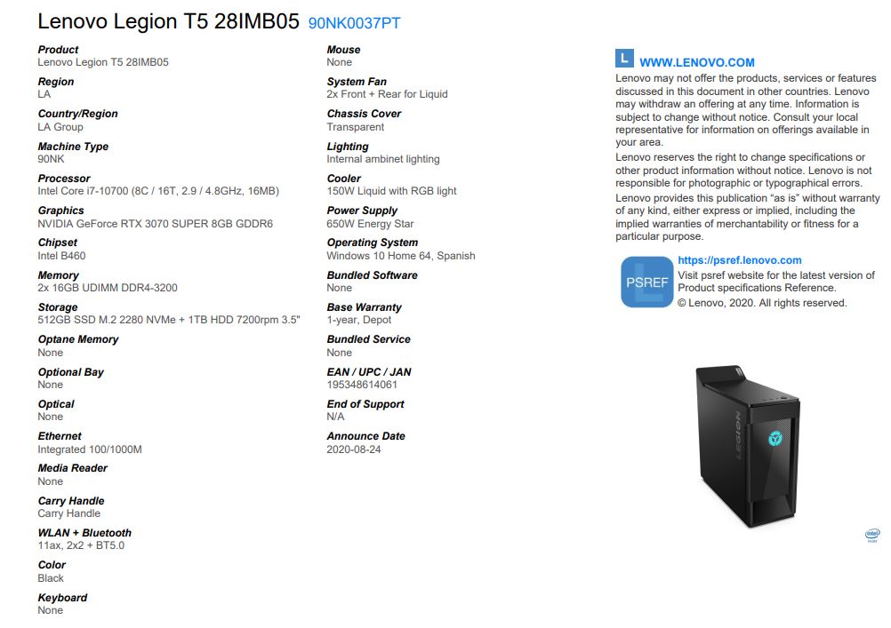The Geforce RTX 3070Ti with 16GB of GDDR6 memory was “confirmed” that it will be a GPU option on Lenovo T7 gaming desktops. On the other hand, the Lenovo Legion T5 28IMB05 spec sheet also shows an unannounced Nvidia GeForce RTX 3070 Super with 8GB of GDDR6 memory.