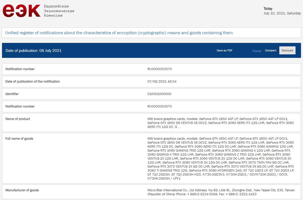 MSI's Hydrogen series might be coming back, as seen on an EEC listing filed by the company. According to the listing, the new Hydrogen series will only feature one SKU, an RTX 3090 card, but MSI may launch more cards further down the line. Moreover, the listing also includes MSI's lineup of LHR GPUs, featuring multiple RTX 3080, 3070, 3060 Ti, and 3060 models.