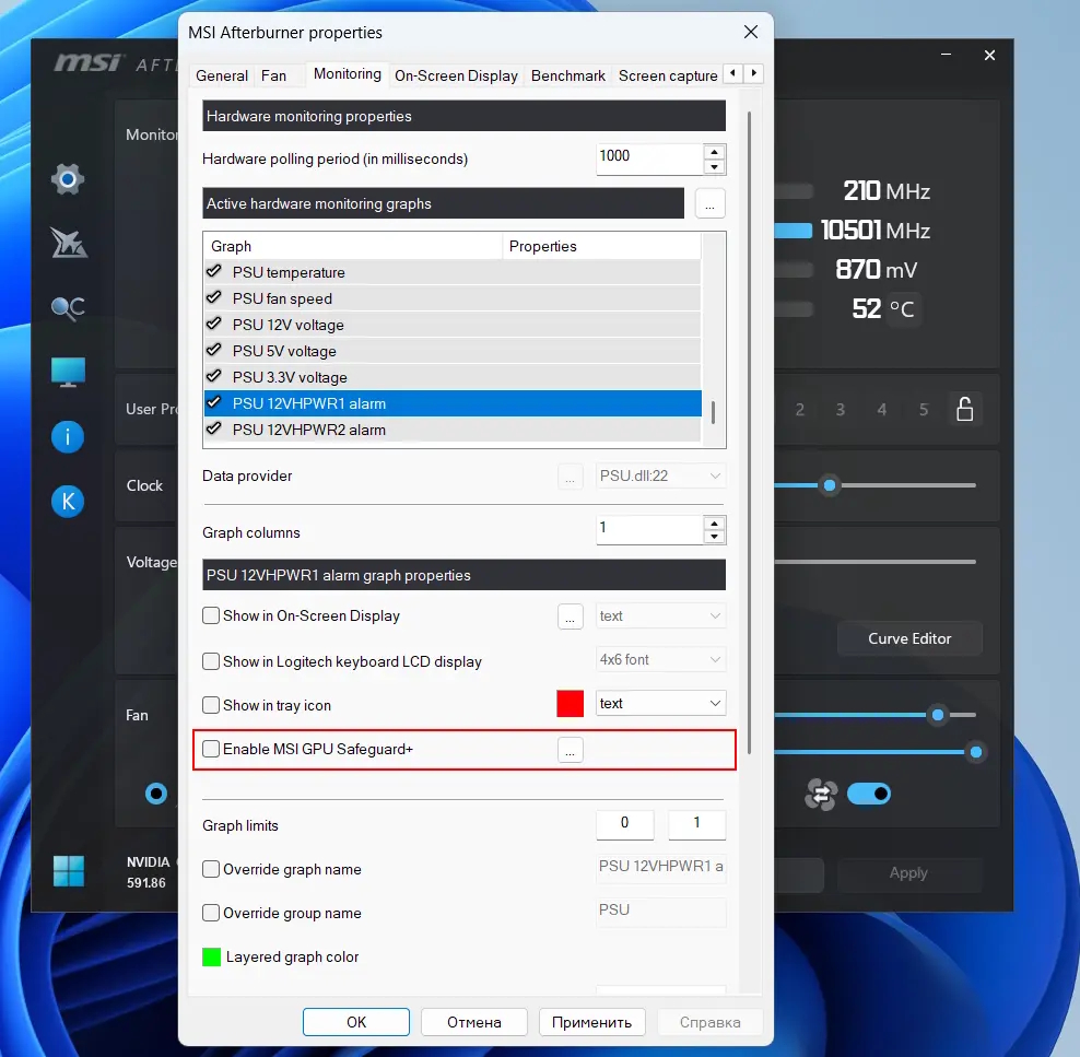 - 12VHPWR/12V-2×6 alarm sensors use new functionality of monitoring plugins to simplify the process of configuring critical thresholds and alarm settings associated with alarm sensors. New “Enable GPU Safeguard+” option is displayed for the alarm sensors instead of “Alarm when value is out of range”, so beginners can easily enable pre-configured protective features with a single click. The following features are being automatically enabled when you tick GPU Safeguard+ checkbox: