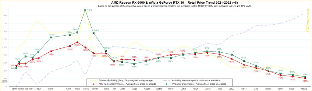 The latest 3DCenter European GPU market analysis shows that the downward price trend has continued in May. Currently, the average Nvidia graphics card is being sold for 7% over its MSRP, while AMD cards are just 2% above MSRP. However, some models, like the Radeon RX 6800, are still being sold for 35% more than they should.
