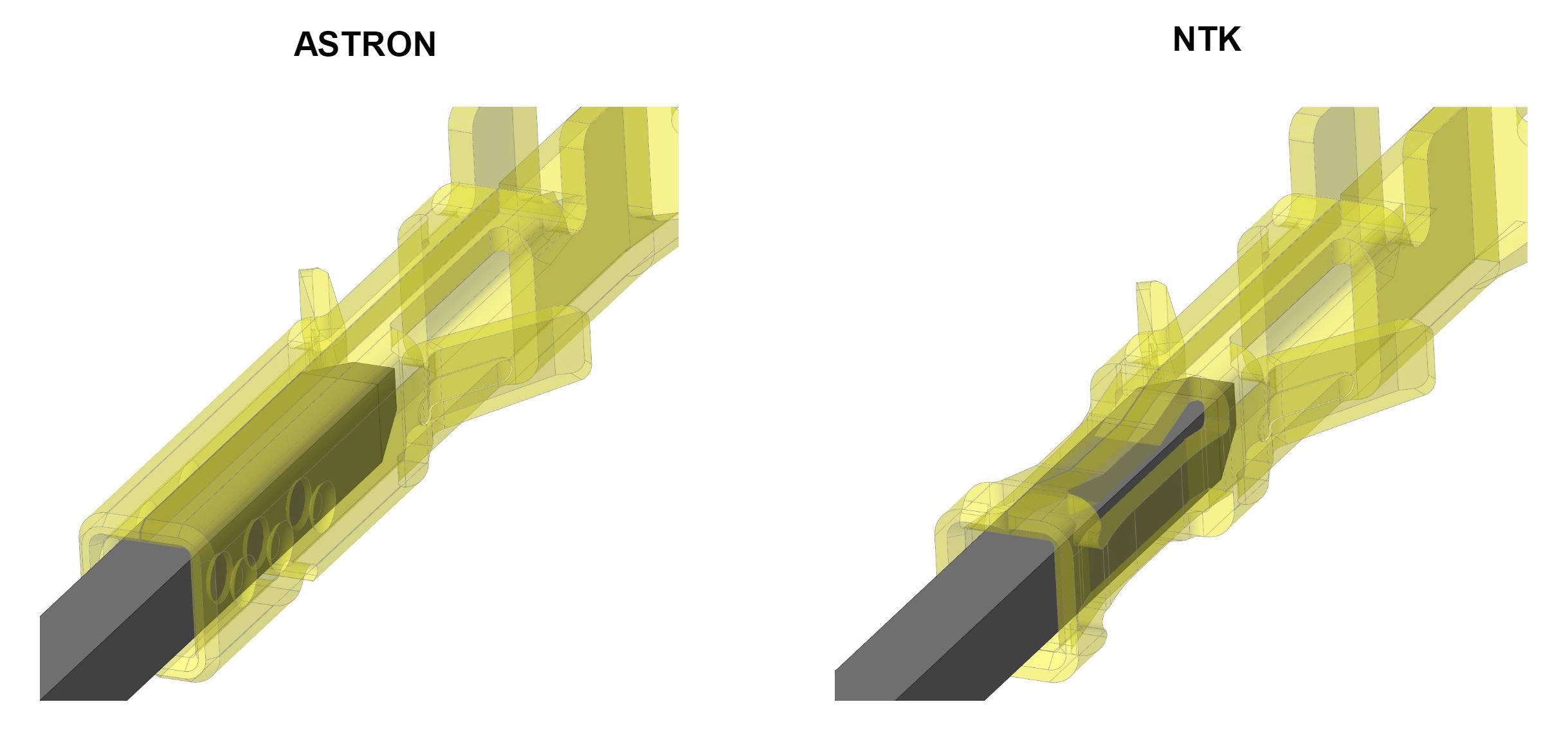 Both are indiscernible to the naked eye and use the same “tulip” connector design, but a closer look will help find the differences. While NTK adapters come with a better latching system and use a one-spring contact design, Astron adapters are easier to plug and come with a two-spring contact design.