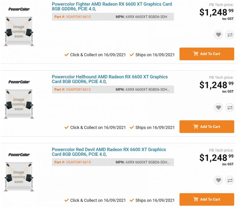 Now, listings of three different Radeon RX 6600 XT models were spotted at a New Zealand retailer. The listings have been removed but VideoCardz was able to take a screenshot showing the prices and names of each model beforehand.