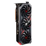 Moving on to this model's specific features, PowerColor recommends an 800W power supply and the utilisation of two 8-pin power connectors to ensure optimal performance for this card. This model also comes with a triple-fan cooling solution, complemented by a cluster of eight heatpipes. A copper plate establishes direct contact with the GPU, enveloping the VRAM and dissipating the heat generated. A high-quality PCB, an 11+3+1+2+1 phase VRM design, and DrMOS featuring IMON real-time digital monitoring to ensure the card's stability during operation.
