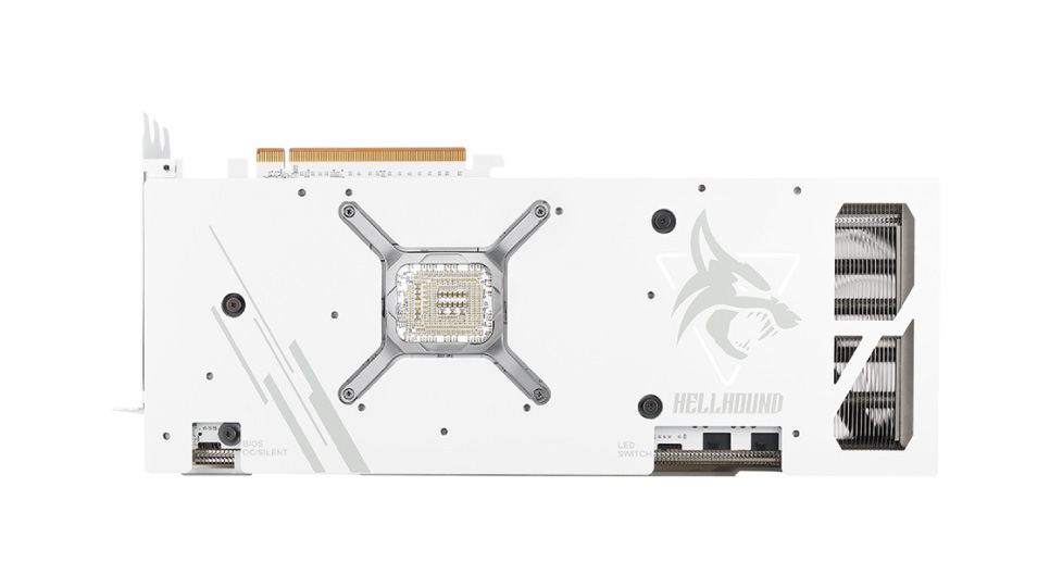 The Radeon RX 7900 XTX Hellhound Spectral White card comes in a 2.5-slot design and features an HDMI 2.1 port and three DisplayPort 2.1. Heat dissipation on the card is achieved via a triple fan design (100mm x 90mm x 100mm), a heatsink with 8x 6mm nickel-plated heat pipes, and a nickel-plated copper base. The GPU's power system consists of a 20-phase VRM design with DrMOS, high polymer capacitors, and two 8-pin PCIe interfaces.