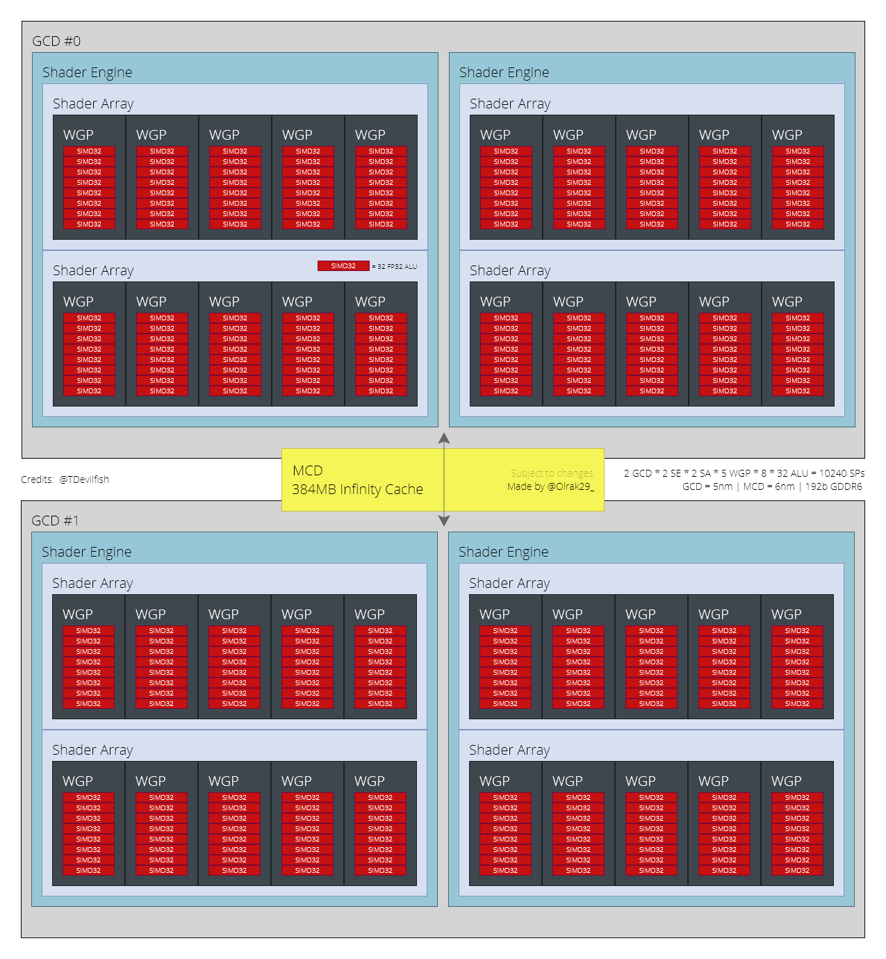 As per Olrak's GPU block diagram of the Navi 31, the next-gen AMD flagship GPU built to power the RX 7900 and 7800 series is expected to have a dual-chiplet design, with 2x CGD based on a 5nm node and an MCD based on a 6nm node. Summed up, this GPU should come with 15,360 stream processors, an undisclosed amount of GDDR6 memory across a 256-bit memory bus, and up to 512MB of Infinity Cache.