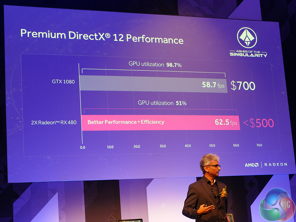Thanks to better support for DirectX12, CrossFire and an improved architectural efficiency, AMD showed a pair of RX480s beating out a single GTX 1080 in a test of Ashes of the Singularity. We weren't privy to which settings were used, but cost wise, it would be far cheaper to buy a pair of RX480s, than it would be a single GTX 1080.