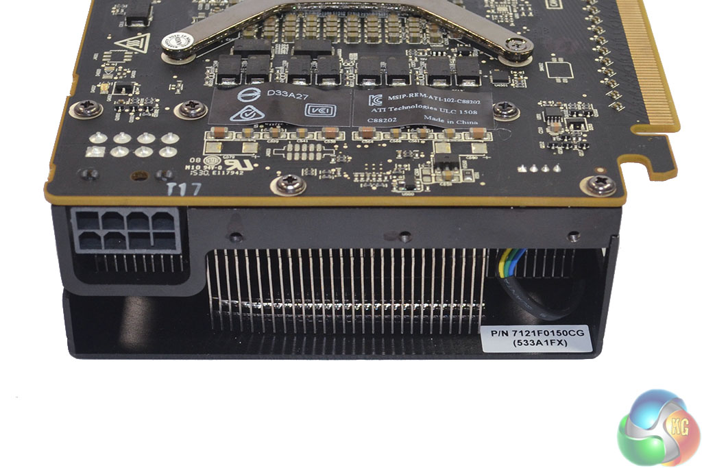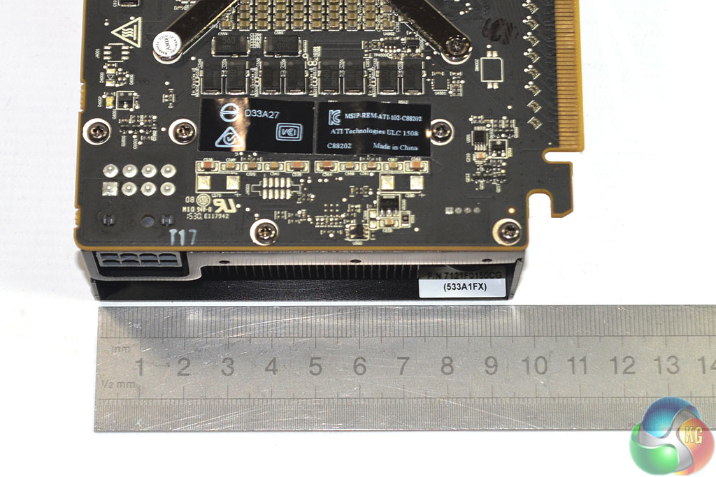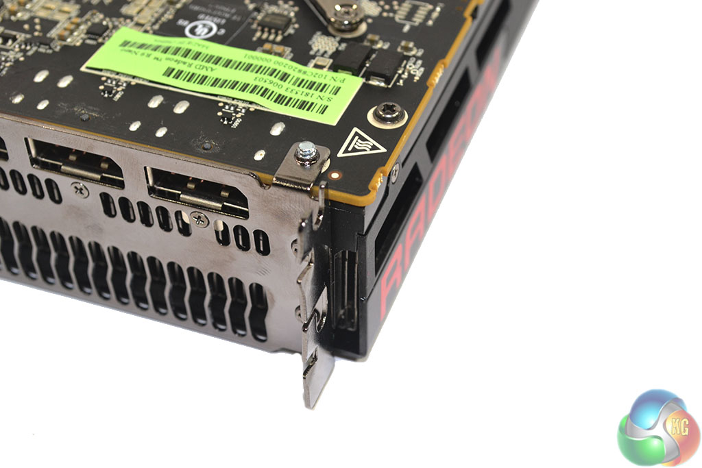 This is where that front-to-back fin array orientation starts to show a minor sign of potential weakness. AMD chose to leave the front end of the card completely open, rather than enclose it with a shroud or extension of the metal plate. With that said, there was little choice because enclosing the front end would likely stagnate the flow of air and create bigger cooling headaches.