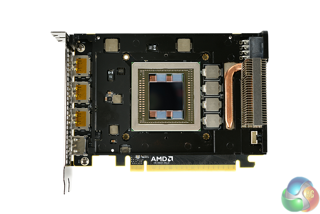 A look at the naked board shows how AMD utilises PCB space. Forming the 4GB VRAM capacity, four stacks of 500MHz HBM chips can be seen merging the interposer and the Fiji GPU. The application of on-package HBM chips is critical in reducing PCB sizing requirements and also power consumption compared to GDDR5. They also give the R9 Nano a 4096-bit bus which creates 512GBps of memory bandwidth when combined with the 500MHz clock.
