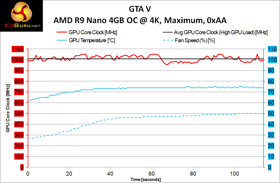 The overclocked R9 Nano configuration saw a healthy performance gain at 4K. The average GPU core clock speed sat a little over the 1GHz mark, although this came at the price of a noticeably higher fan speed increasing noise output.