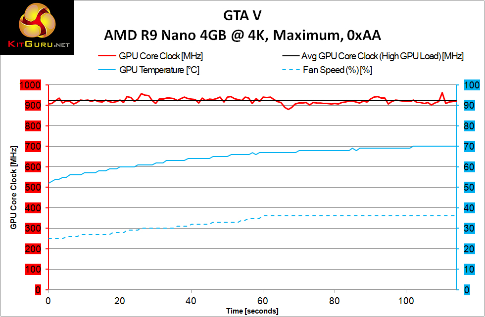 GTA V was one of the more positive game engines when it comes to allowing the R9 Nano's GPU core clock to flex its speed. At 1440P the R9 Nano was able to hit its 1GHz maximum core clock and the average reading was in the high-900MHz range. 4K also saw the card run at an average core clock of more than 900MHz.
