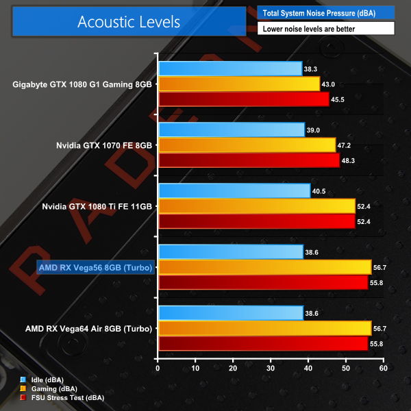 With the same cooler as used on the RX Vega64 operating at the same fan speeds due to temperature throttling, it is no surprise that the Vega56 is equally loud in its ‘Turbo' power state.