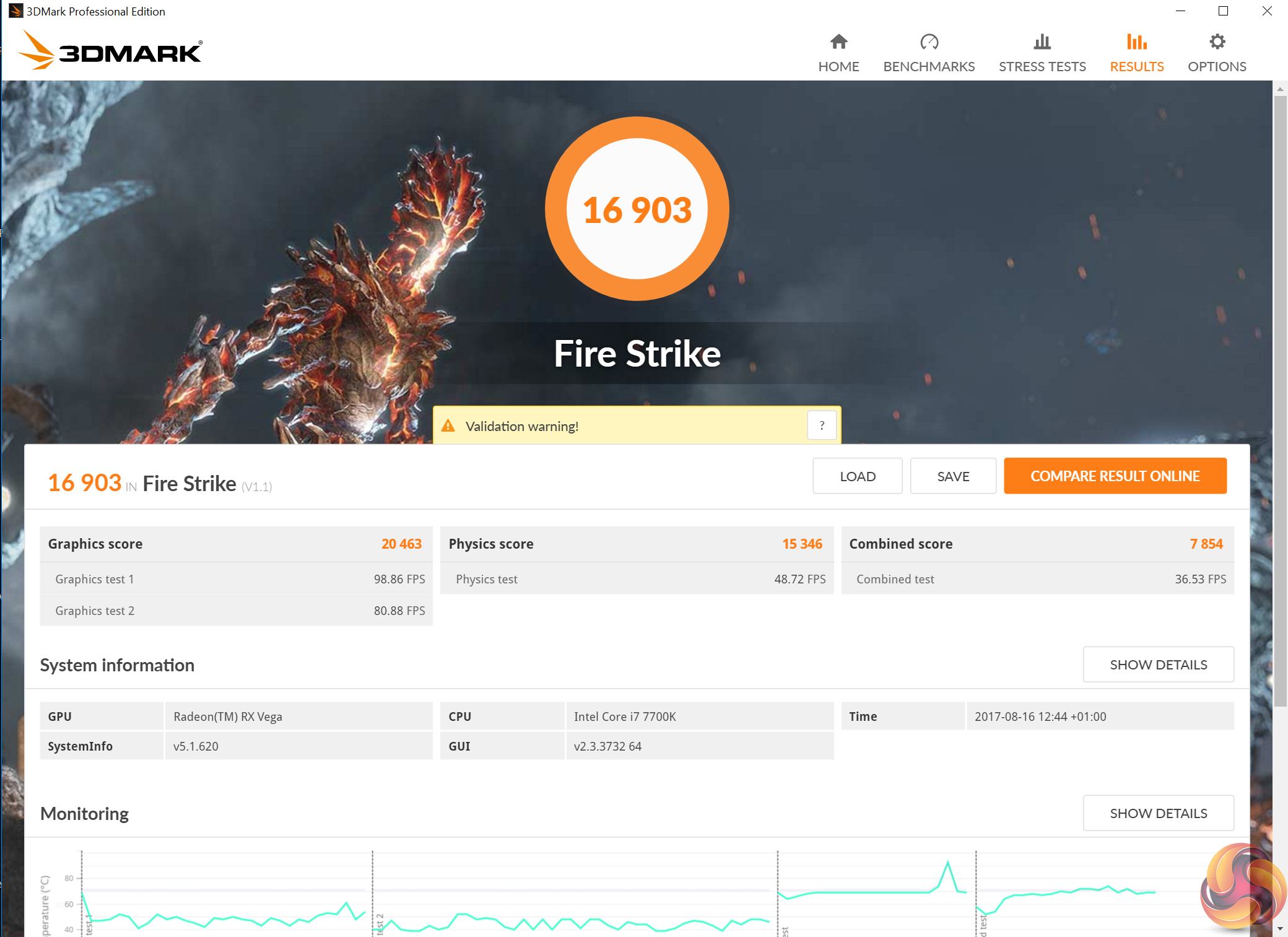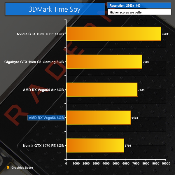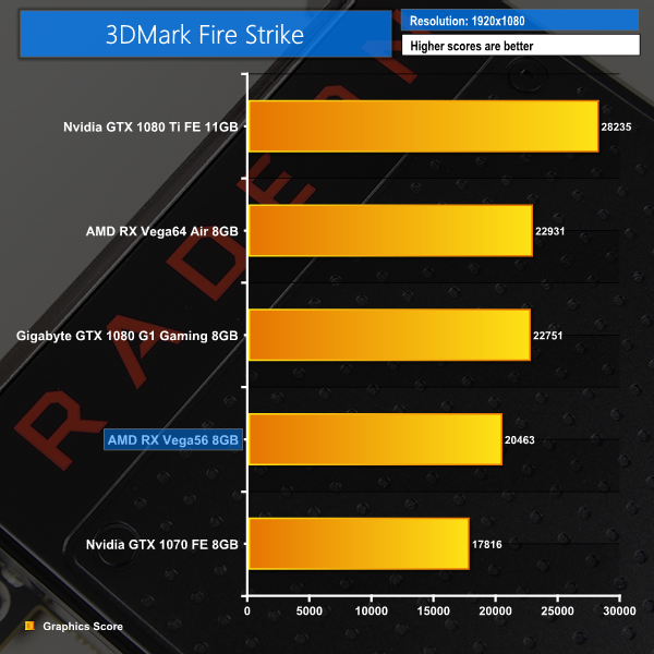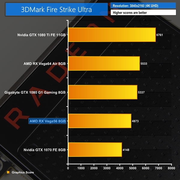 3DMark Fire Strike places the RX Vega56 ahead of the GTX 1070 FE and behind a factory-overclocked GTX 1080. Fire Strike Ultra and 3DMark Time Spy both show similar performance, with the Vega56 sat between a GTX 1070 FE and a Vega64 Air or faster-than-stock GTX 1080.
