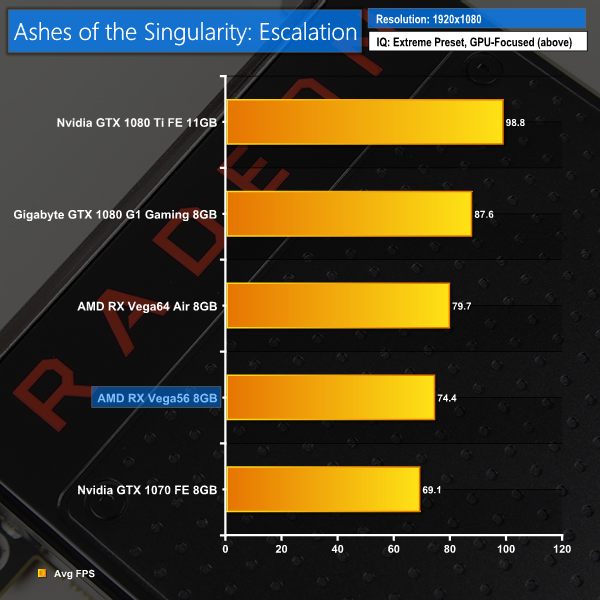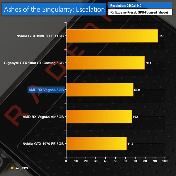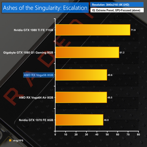 Ashes shows some interesting results, with the Vega56 repeatedly outperforming Vega64 at higher resolutions. The slightly lower average boost clock speed and fewer GPU cores of the Vega56 are likely allowing the card to maintain that boost clock speed better than the Vega64 can.
