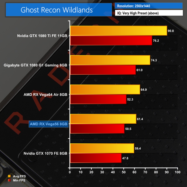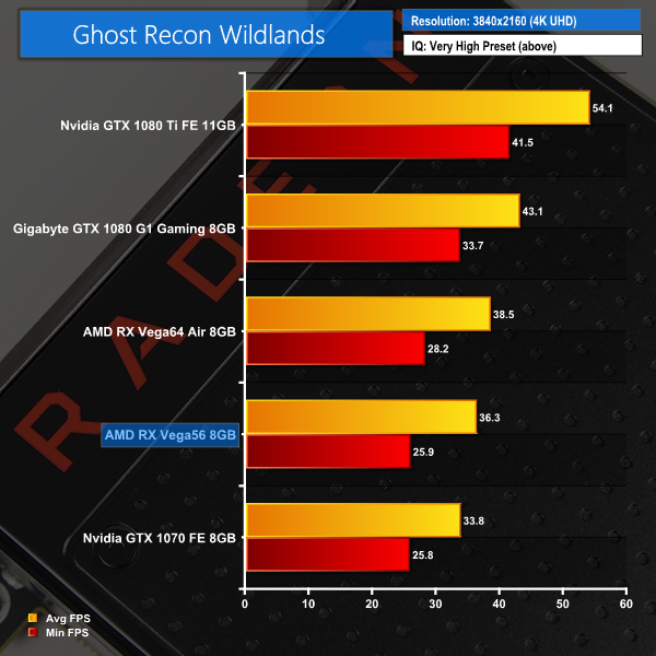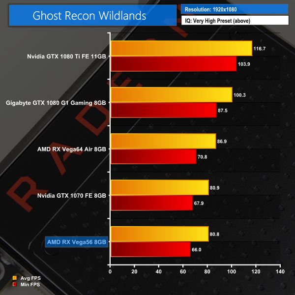 Vega56 is a slightly better offering than GTX 1070 FE for Ghost Recon Wildlands. The two cards are tied at 1080P but AMD's Vega56 opens up leads of 2 FPS (3.4%) at 1440P and 2.5 FPS (7.4%) at 4K.