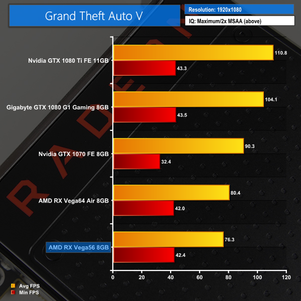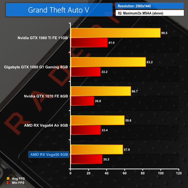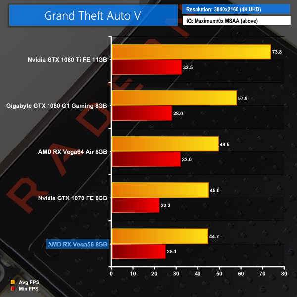 GTA V prefers Nvidia hardware so the GTX 1070 FE hands the RX Vega56 a solid beating at 1080P and 1440P. AMD's card manages to retain its performance more effectively as the resolution increases to 4K and in doing so ties with GTX 1070 FE at this 8 MegaPixel resolution.