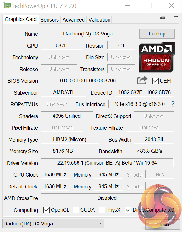 Looking at raw horsepower, AMD's RX Vega64 Air is built around a 486mm2 14nm manufactured ‘Vega 10' GPU consisting of 12.5 Billion transistors. 64 Next-Gen CUs create 4096 stream processors that can clock up to 1630MHz on the air card to give peak single-precision performance of around 13 TFLOPS. Half precision performance sits more in the mid-20s TFLOPS range, allowing (theoretically) higher performance in certain scenarios for upcoming games that have been touted to support FP16 Rapid Pack Math, such as Wolfenstein 2 and Far Cry 5.