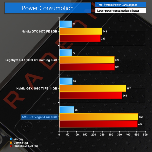 Power consumption is clearly not a strength for AMD's RX Vega64 Air card. Using the performance-biased ‘Turbo‘ mode in WattMan, the system with RX Vega64 Air installed will happily draw more than 450W from the wall. Even the significantly faster GTX 1080 Ti FE draws noticeably less power when gaming or heavily stressed.