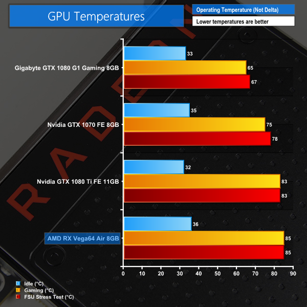 We first measure GPU temperature while the card is sat idling at the Windows 10 desktop for 5 minutes. Gaming GPU temperature is recorded by running the Deus Ex benchmark at 4K. As a maximum stress test, Fire Strike Ultra Stress Test is run 5 consecutive times and the cards' GPU temperature levels are recorded.