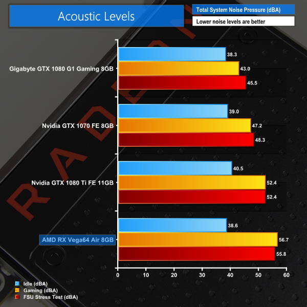 High power draw translates into high temperatures which then translates into high noise output. Power is the key driving factor and the fact the RX Vega64 is so inefficient in its performance-orientated ‘Turbo' mode makes it hard for the other two metrics to look positive.