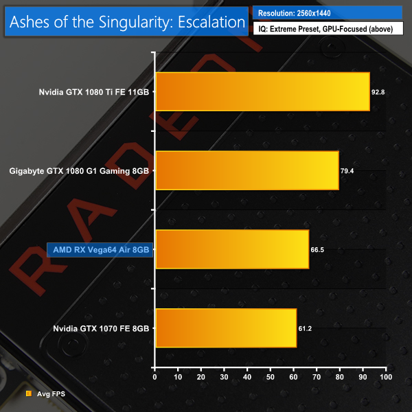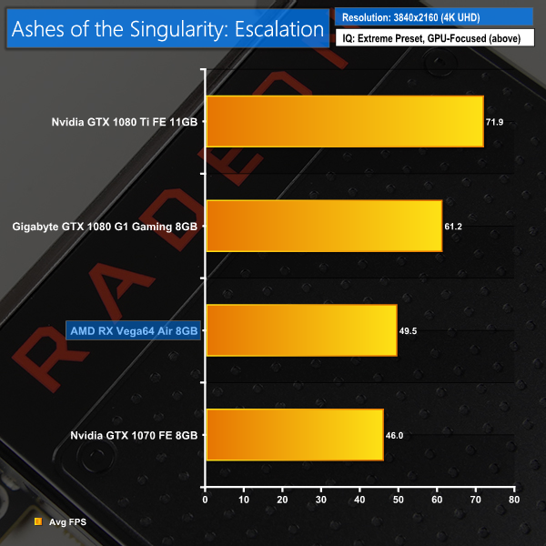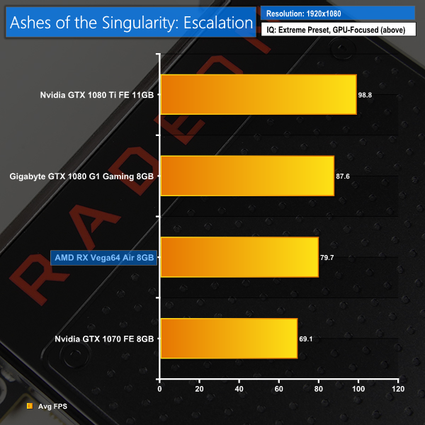AMD's air-cooled RX Vega64 sits above the GTX 1070 FE and below a factory-overclocked GTX 1080 at all resolutions for Ashes of the Singularity: Escalation DX12. Gigabyte's well-cooled GTX 1080, that hits around 1936MHz boost core clock in games, is 9.9% faster at 1080P, 19% faster at 1440P, and 24% faster at 4K.