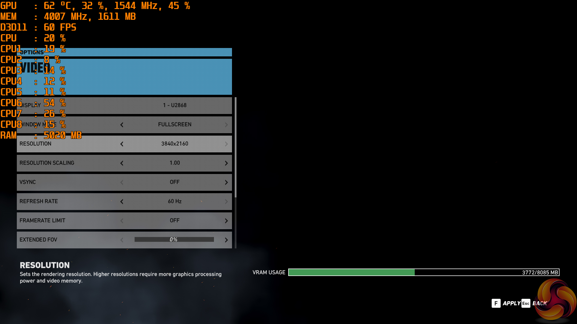 At 1080p the game suggests around 2.9GB of VRAM usage. At 1440p that number increases to around 3.1GB. At 4K the video memory usage is quoted as around 3.8GB.