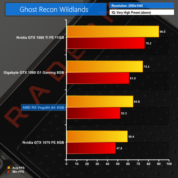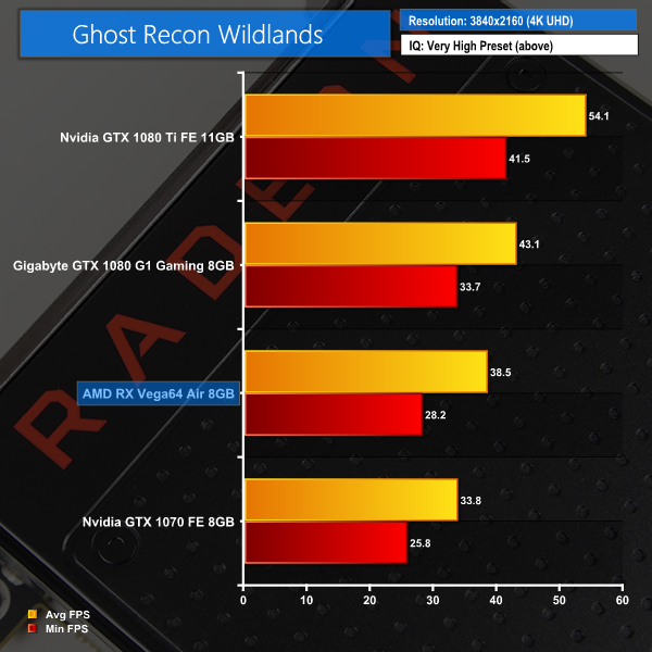Ghost Recon Wildlands sits the RX Vega64 back between GTX 1070 FE and GTX 1080 OC partner card performance. In most cases, the performance of AMD's air-cooled card is closer to that of the GTX 1070 FE.