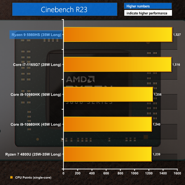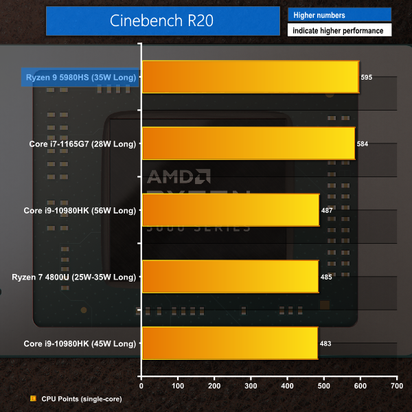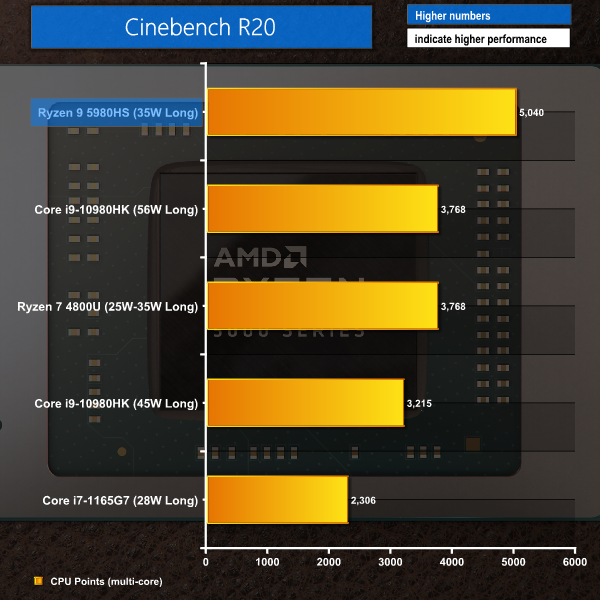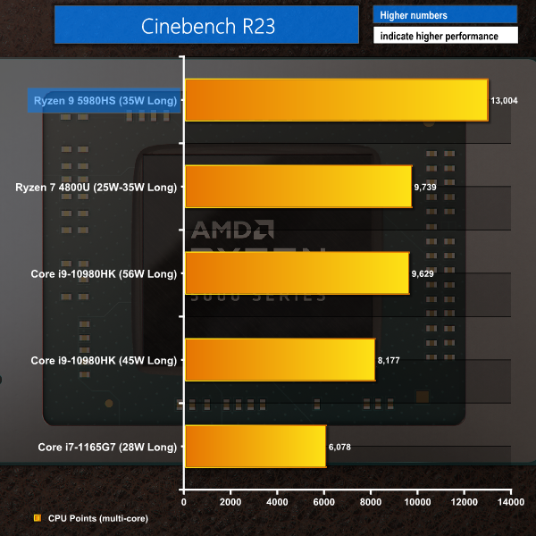 Eight Zen 3 cores running at around 3.9GHz for the initial 60W clock surge deliver a very strong victory for the Ryzen 9 5980HS in Cinebench R20. Intel’s power-hungry Core i9-10980HK is beaten by a large – 34% – margin and the Flow X13 is over twice as fast as Razer’s Intel Tiger Lake competitor.