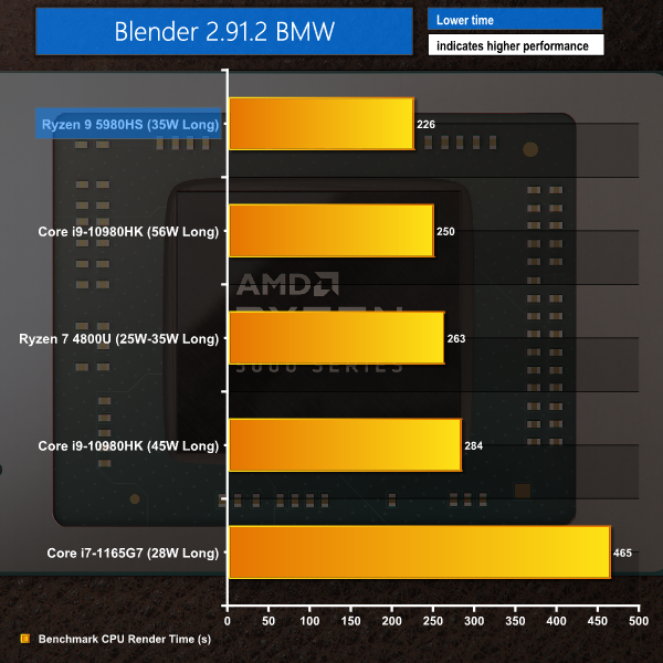 Another convincing performance victory is shown by the Ryzen 9 5980HS in Blender’s quick BMW test. This time, AMD’s 35W TDP chip cuts 10% off the render time compared with Intel’s high-powered Core i9 flagship and more than doubles the 28W Tiger Lake i7’s performance.