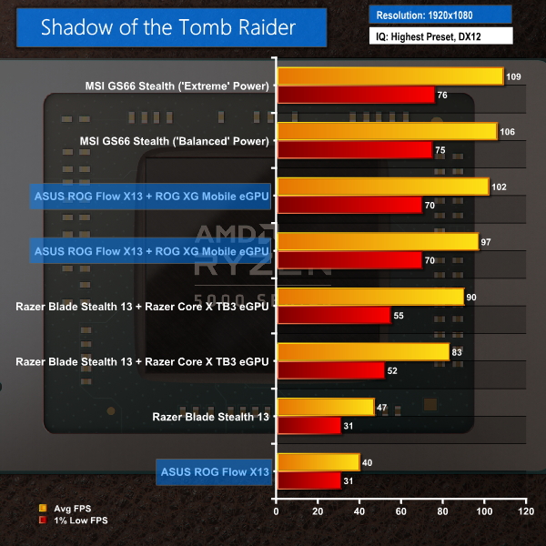We are testing the eGPU configurations running the display back to the laptop screen and also running to an external monitor. There can be sizable variations in eGPU performance from test-to-test and some games are less punishing than others for routing back to the internal laptop display. It will be interesting to see if the higher bandwidth connection on ASUS’ technically less powerful eGPU will allow it any performance victories.