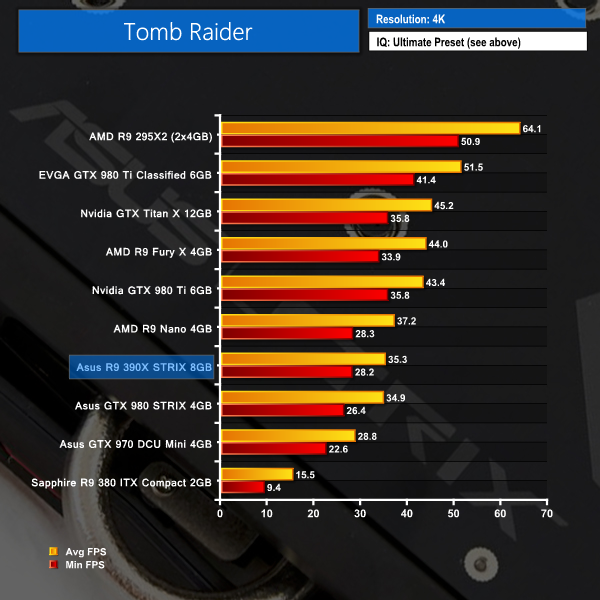 Tomb raider performance for the R9 390X STRIX DC3 OC is about equal to that of Asus' factory-overclocked GTX 980.