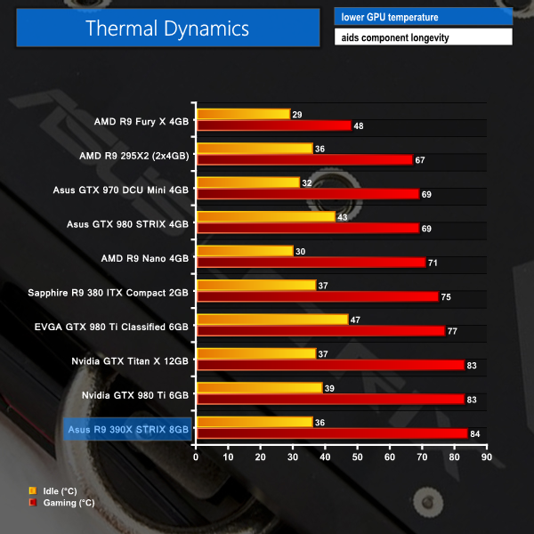The former Hawaii XT (now Grenada XT) core is known for its high operating temperatures from the R9 290X days. Even Asus' sizable triple-fan DirectCU III cooler has a tough job taming the hot core while also maintaining sensible fan speeds. 84°C under gaming load is fine for everyday usage, although it is higher than I would personally like to see for a card of this performance level (the 83°C Titan X and GTX 980 Ti are significantly faster). A simple way of reducing operating temperatures is by setting a custom fan speed curve in third party software.