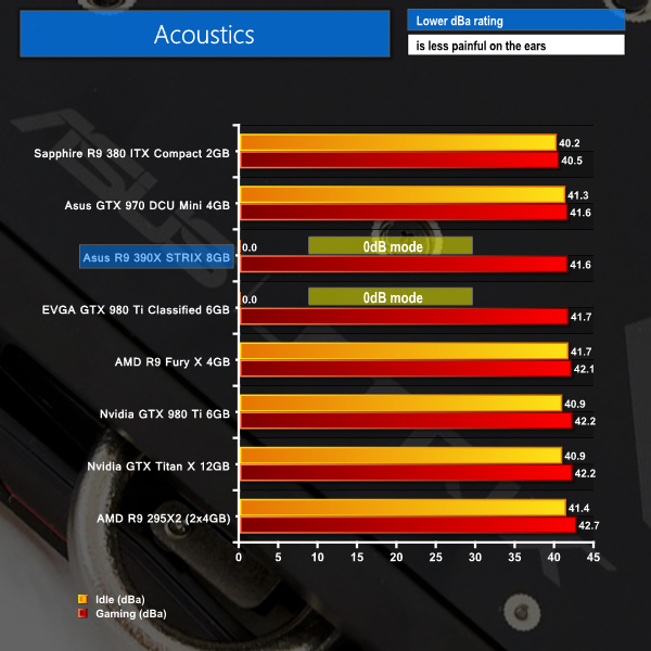Asus' card is noticeably quiet, even when the limitations of our testing environment are accounted for. I am glad to report that there was no significant coil whine from Asus' R9 390X STRIX DC3 OC, so the Super Alloy Power II components are doing their job well.