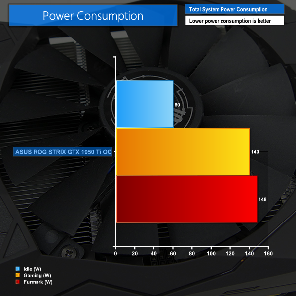 Unfortunately, a death to our Core i5-6400 CPU means that we are no longer able to use the same system used for testing the other graphics cards. This means that our power consumption data is only able to show ASUS' ROG STRIX GTX 1050 Ti OC due to the use of a different test system with different power draws.