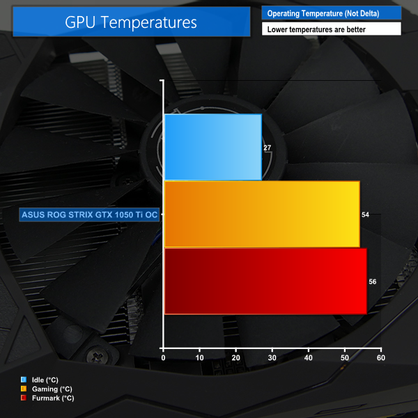 Unfortunately, a death to our Core i5-6400 CPU means that we are no longer able to use the same system used for testing the other graphics cards. This means that our temperature data is only able to show ASUS' ROG STRIX GTX 1050 Ti OC due to the use of a different test system with different temperatures.