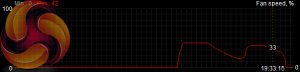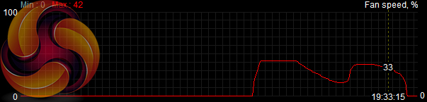 The above screenshot shows fan behaviour for a 5-minute loop of Unigine Heaven at 1080P. Note the cyclic behaviour as the GPU temperature switches above and below the 55°C 0% cut-off point.