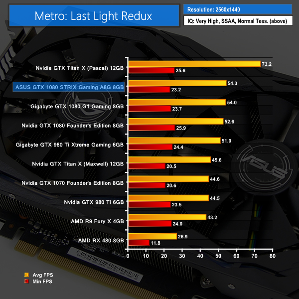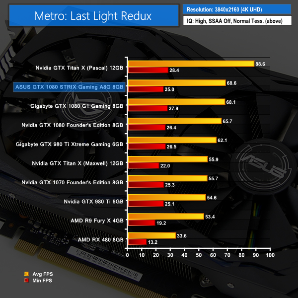 Similar performance is shown between the ASUS and Gigabyte GTX 1080s in Metro: Last Light Redux, with both cards being around 1-3 FPS faster than the GTX 1080 FE.
