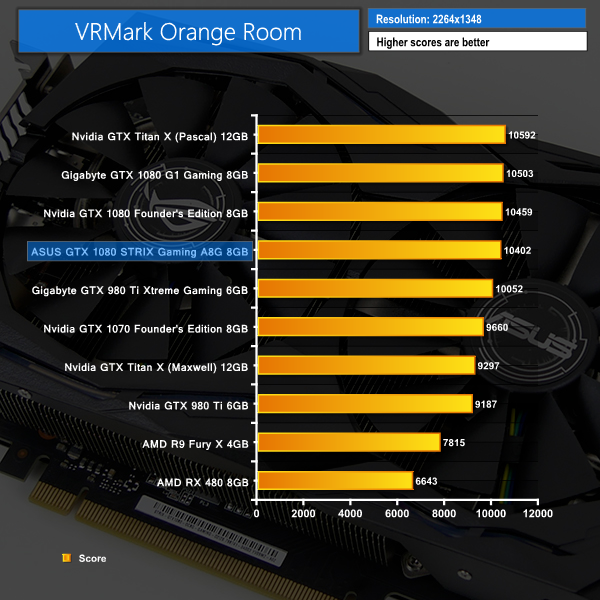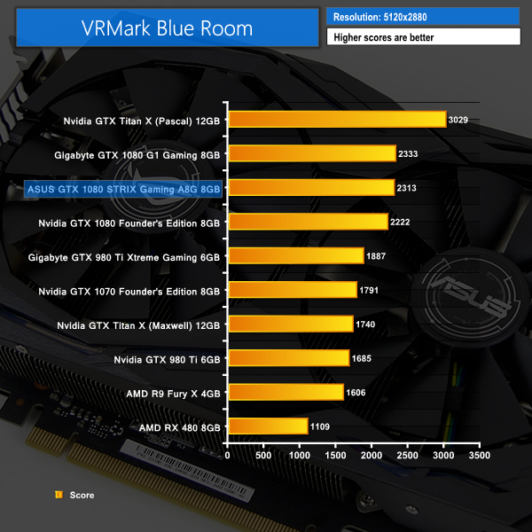 ASUS' ROG STRIX GTX 1080 A8G is very close to the performance of Gigabyte's factory-overclocked board in both tests and also manages to outperform the GTX 1080 FE in the more-demanding Blue Room run.