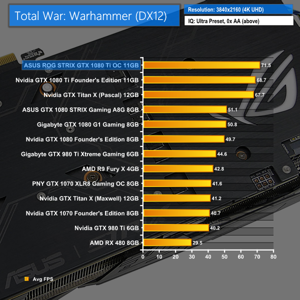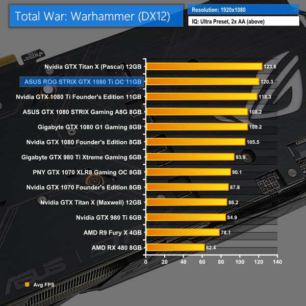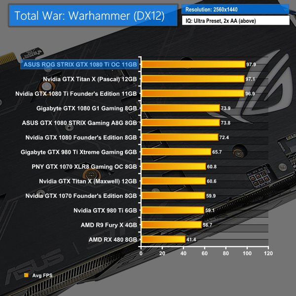 Total War: Warhammer shows tighter grouping between the GTX 1080 Ti solutions until the 4K test resolution. At 1440P, the ASUS ROG STRIX and Nvidia Founder's Edition GTX 1080 Ti solutions are practically equivalent. Increasing the resolution to eight Megapixels sees ASUS' card pull ahead by 4.1%.