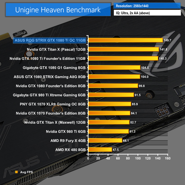 Seeing the pattern yet? Another chart-topping display by the ASUS ROG STRIX card with its performance increase over the GTX 1080 Ti Founder's Edition competitor being 6.7%. This improvement is heavily related to ASUS' stronger cooling solution which minimises thermally-induced core frequency throttling, unlike the Founder's Edition card.